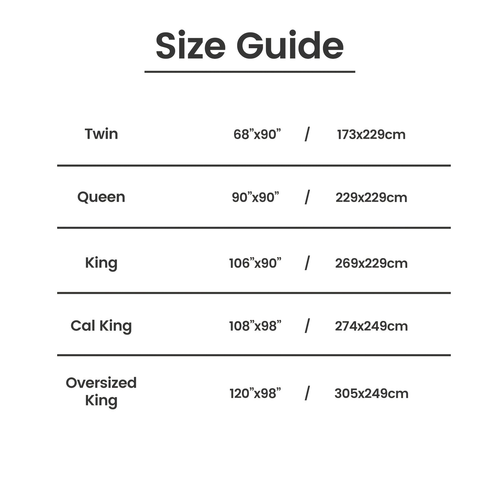 Oversized King, California King, King, Queen, Twin